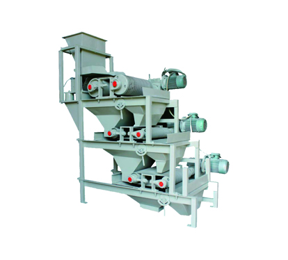 本機由分選磁輥、張緊輥、傳送分選膠帶、分隔板與給料器等幾個部分構成。待處理物料經過給料器進入分選帶,由分選帶將料送到磁輥磁場區,磁性顆粒被吸住,隨磁輥轉到下方落入磁性產品槽,非磁性顆粒在慣性的作用下被拋離磁輥帶麵,落入非磁性產品槽。